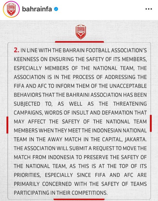 BeritaWonogiri.com [JAKARTA] – Timnas Bahrain dilaporkan merasa cemas menjelang laga lanjutan Kualifikasi Piala Dunia 2026 zona Asia melawan Indonesia, yang dijadwalkan berlangsung di Stadion Gelora Bung Karno (GBK). Melalui akun Instagram resminya (@bahrainfa), Federasi Sepak Bola Bahrain mengumumkan bahwa mereka telah meminta AFC dan FIFA untuk memindahkan pertandingan tersebut ke luar Indonesia.