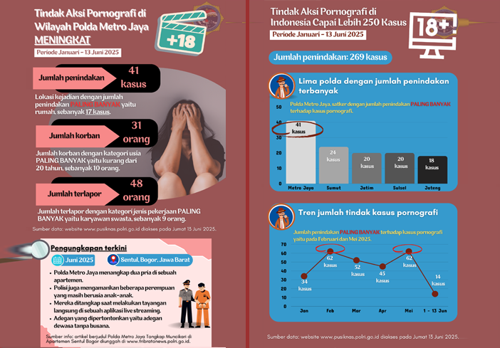 Sejak Januari sampai 13 Juni 2025, Polda Metro Jaya menindak 41 kasus pornografi. Hampir separuh atau 41,46 persen penindakan dilakukan di rumah sebagai tempat kejadian perkara.