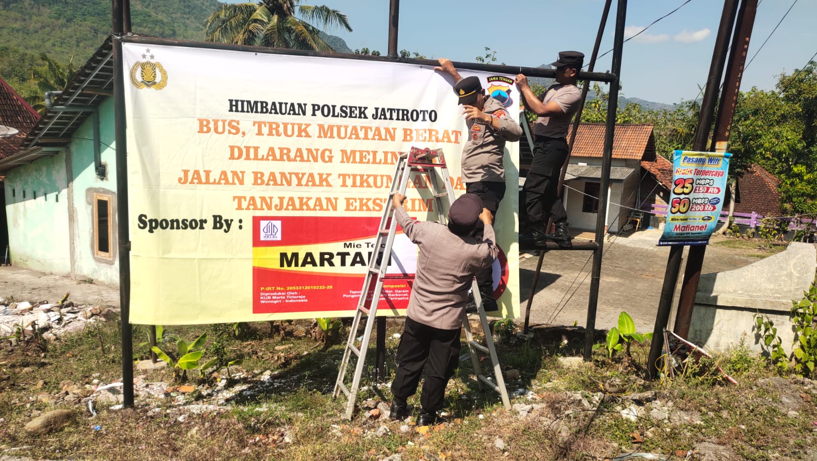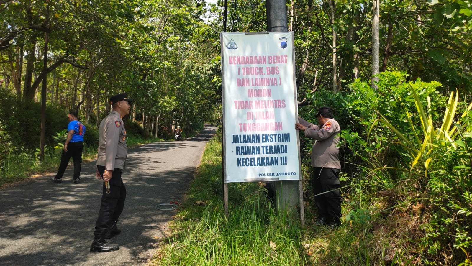 Beritawonogiri.com [JATIROTO] – Polisi dari Polsek Jatiroto, Polres Wonogiri, melakukan langkah antisipatif dengan memasang beberapa spanduk himbauan Kamtibmas di jalur ekstrem yang menghubungkan Kecamatan Jatiroto dan Tirtomoyo. Aksi ini dilakukan untuk mengingatkan para pengemudi bus dan truk bermuatan berat agar tidak melintasi Jalur Tunggangan, yang dikenal berbahaya karena memiliki medan curam dan tikungan tajam.