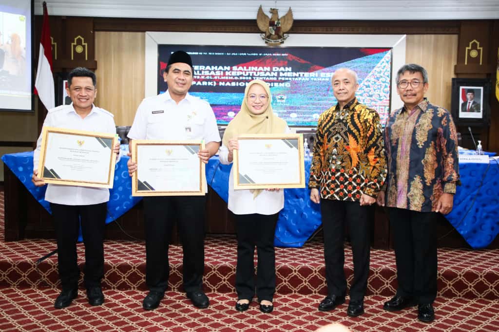 Wagub Jateng Gus Yasin menerima sertifikat penetapan Geopark Nasional Dieng dari Kepala Badan Geologi Kementerian ESDM. (Foto: Syahidan)