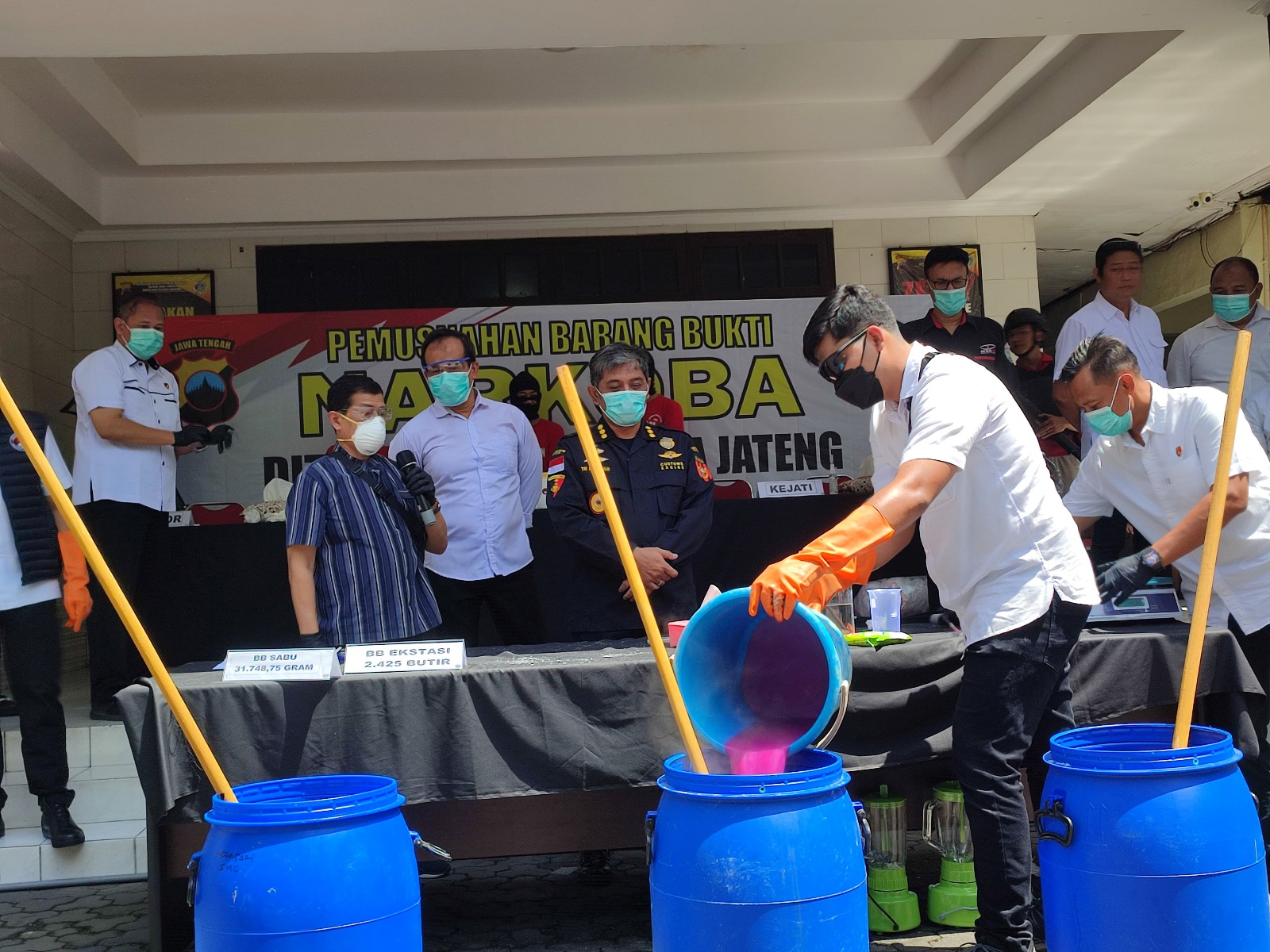 BeritaWonogiri.com [KOTA SEMARANG] – Direktorat Reserse Narkoba Polda Jawa Tengah memusnahkan barang bukti narkotika seberat 31,75 kilogram (kg) dan 2.425 butir ekstasi. Barang bukti tersebut berasal dari 3 kasus berbeda yang melibatkan empat orang tersangka.