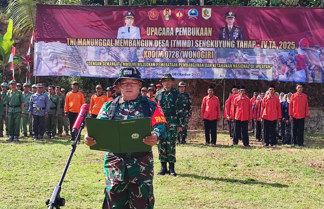 Beritawonogiri.com [KARANGTENGAH] – Program TNI Manunggal Membangun Desa (TMMD) Sengkuyung Tahap IV Tahun 2025 Kodim 0728/Wonogiri resmi digelar di Lapangan Desa Ngambarsari, Kecamatan Karangtengah, Wonogiri, Rabu (8/10/2025). Acara pembukaan dihadiri Wakil Bupati Wonogiri, Setyo Sukarno sebagai Inspektur Upacara dan Kapten Arm Yadiman sebagai Komandan Upacara.