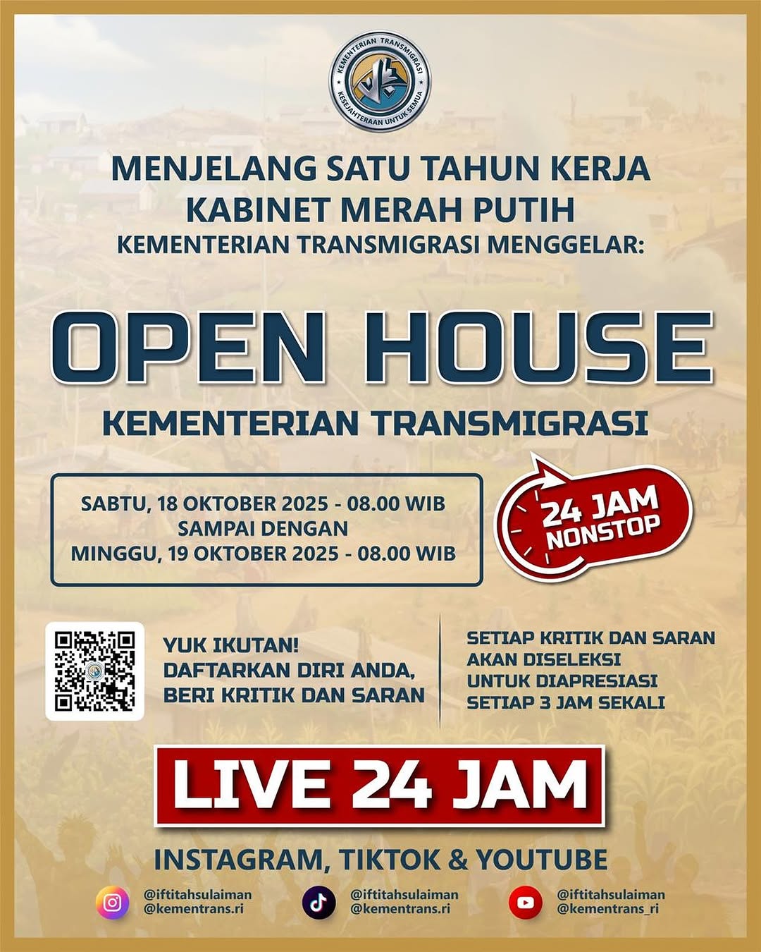Kementerian Transmigrasi ajak publik aktif beri ide, kritik, dan solusi selama 24 jam nonstop dalam Open House Transformasi Transmigrasi.