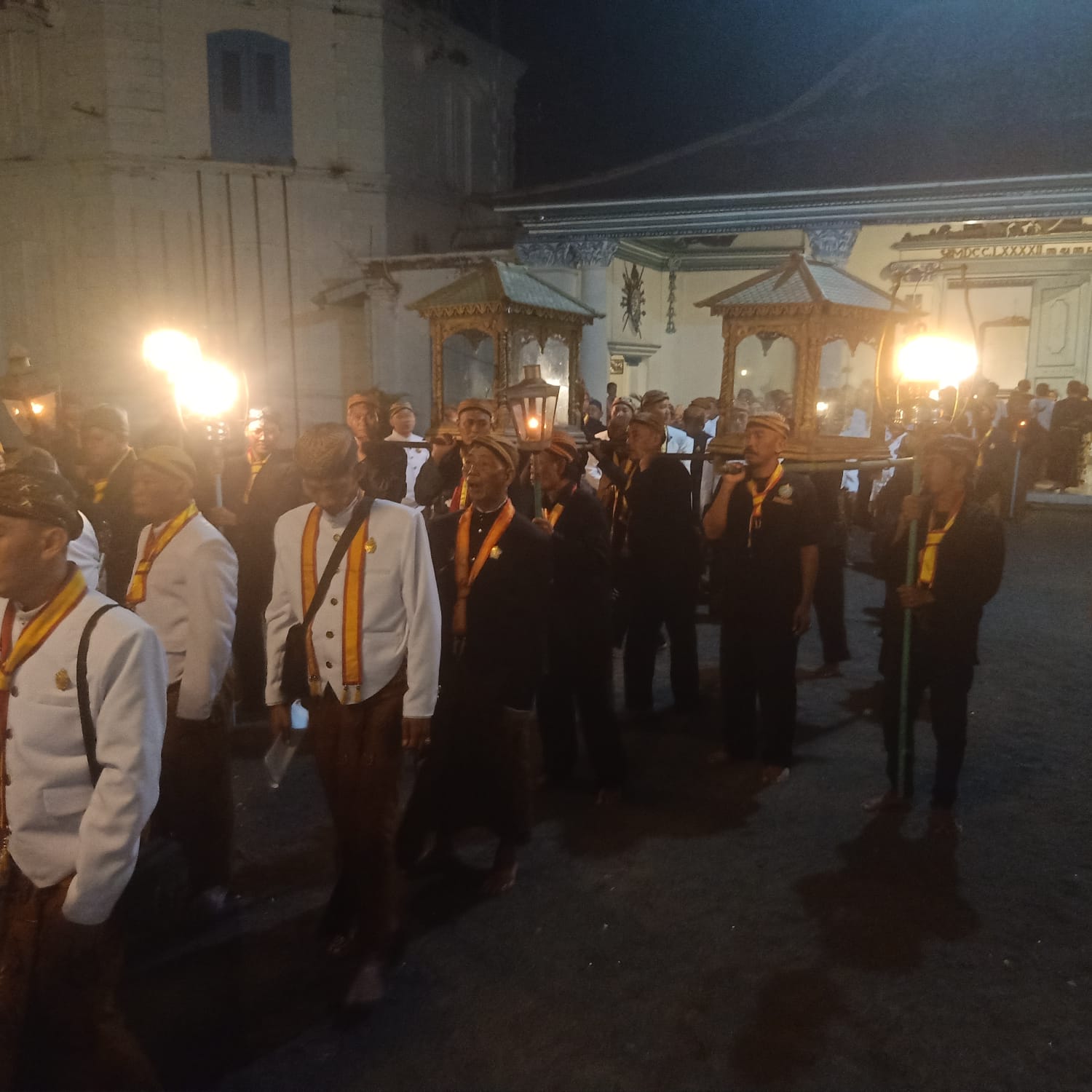 Rombongan pengusung jodang dan joli berisi beras untuk zakat fitri berjalan dari Keraton Surakarta menuju Mesjid Agung, Surakarta, Jateng, Sabtu 6 April 2024 malam. (BeritaWonogiri.com/Iskandar)
