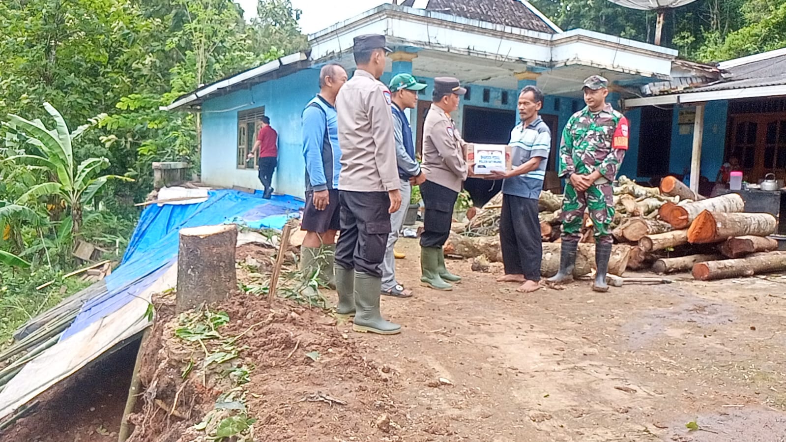 Kapolsek bersama anggota datang untuk melakukan kerja bakti pembersihan material longsoran dan menyerahkan bingkisan berupa sembako kepada korban yang terdampak longsor, Kamis kemarin.