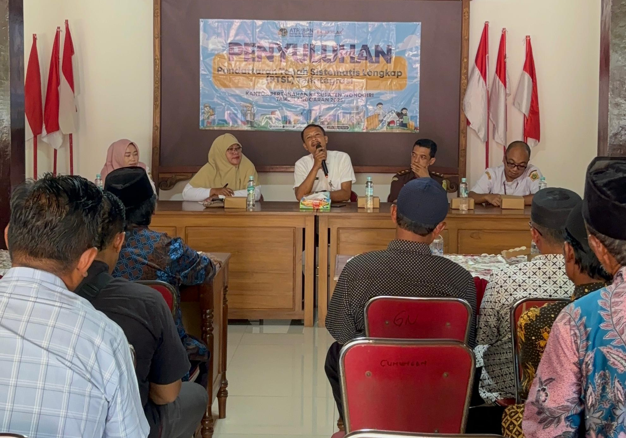 Langkah awal pelaksanaan PTSL Terintegrasi ini adalah penyuluhan atau sosialisasi kepada masyarakat desa yang menjadi lokasi penetapan PTSL. Salah satunya dilaksanakan di Balai Desa Gunungan, Kecamatan Manyaran, Kabupaten Wonogiri, Kamis 17 April 2025.